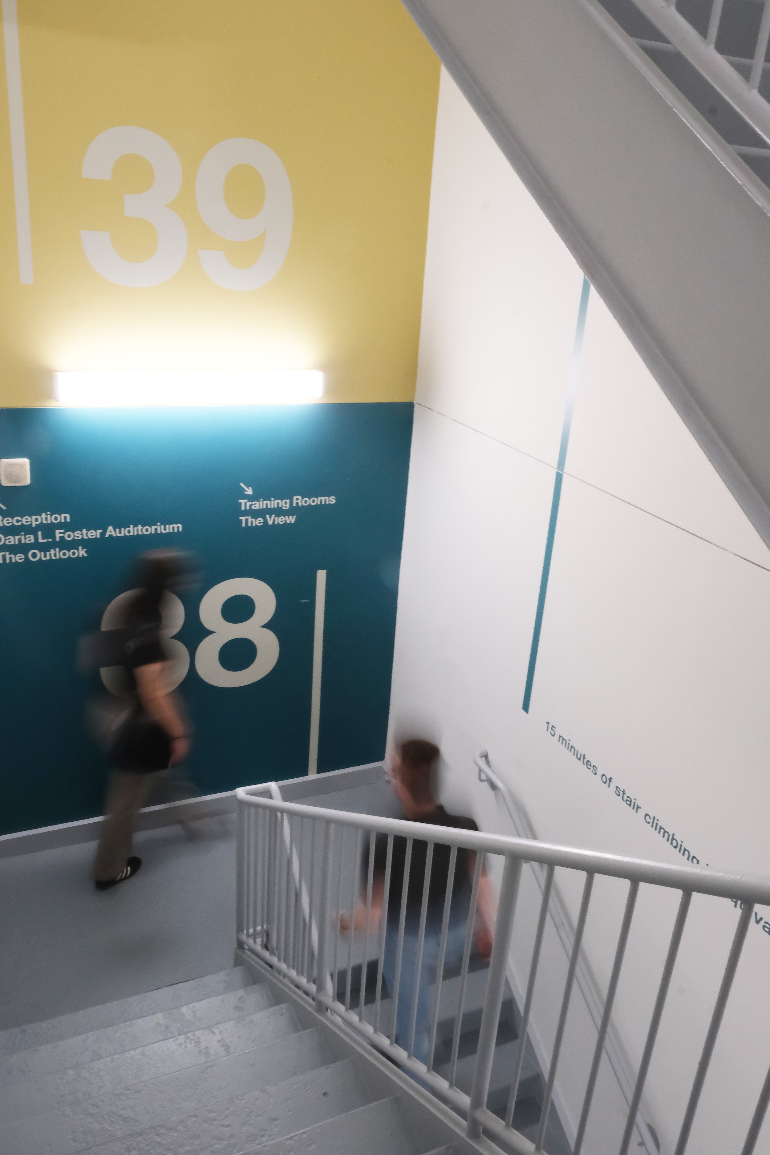 Each floor is assigned a unique color—Dark Teal for the 36th, Rust for the 37th, Teal for the 38th, Brass for the 39th, and Dark Bronze for the 40th—tying into the interior design and brand’s identity. The last two floors act as “jewelry,” enhancing the client-facing areas. This color palette is extended into the stairwells as vibrant graphics to promote heart health while creating a sense of community and connection.